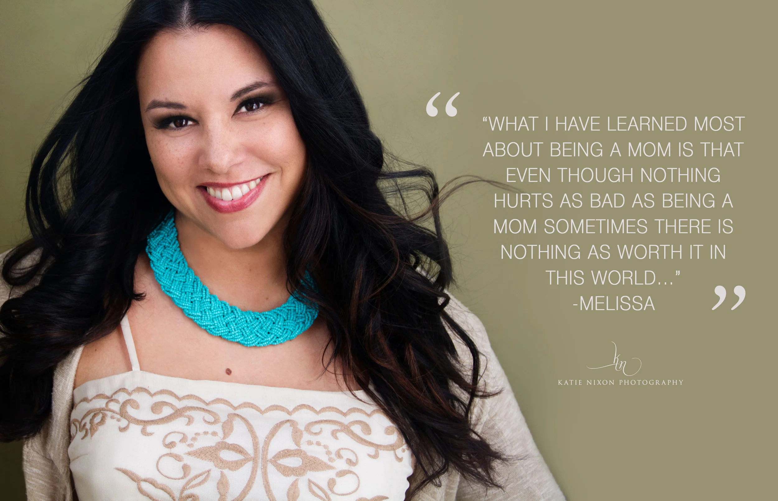 I learned about creativity when my daughter decided to cut my sons hair to the scalp, color on the walls, and dump out my nail polish and perfumes. I learned about heartbreak when I held a crying teenage girl in my lap because her heart had been broken for the first time.What I have learned most about being a mom is that even though nothing hurts as bad as being a mom sometimes there is nothing as worth it in this world." - Melissa